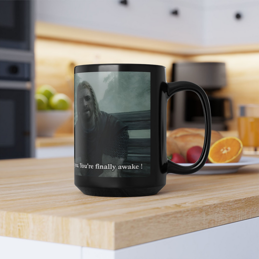 The Skyrimug is a fan-inspired product featuring the iconic “Finally, you’re awake” meme, crafted for fans who love the world of Skyrim.